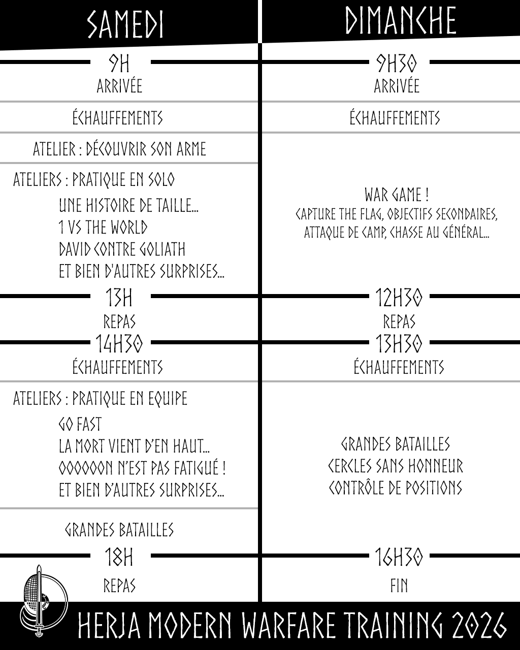 Sur deux jours, nous vous proposerons différents ateliers individuels, pour y découvrir ou améliorer le maniement de différentes armes mais aussi des exercices à plusieurs afin de progresser dans le travail en groupe.